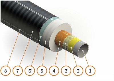 Труба ИЗОПРОФЛЕКС-115A 1 МПА представляет собой многослойную конструкцию, состоящую из напорной трубы, теплоизолирующего слоя и защитной оболочки.