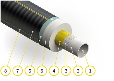 Труба ИЗОПРОФЛЕКС-A 1 МПА представляет собой многослойную конструкцию, состоящую из напорной трубы, теплоизолирующего слоя и защитной оболочки.